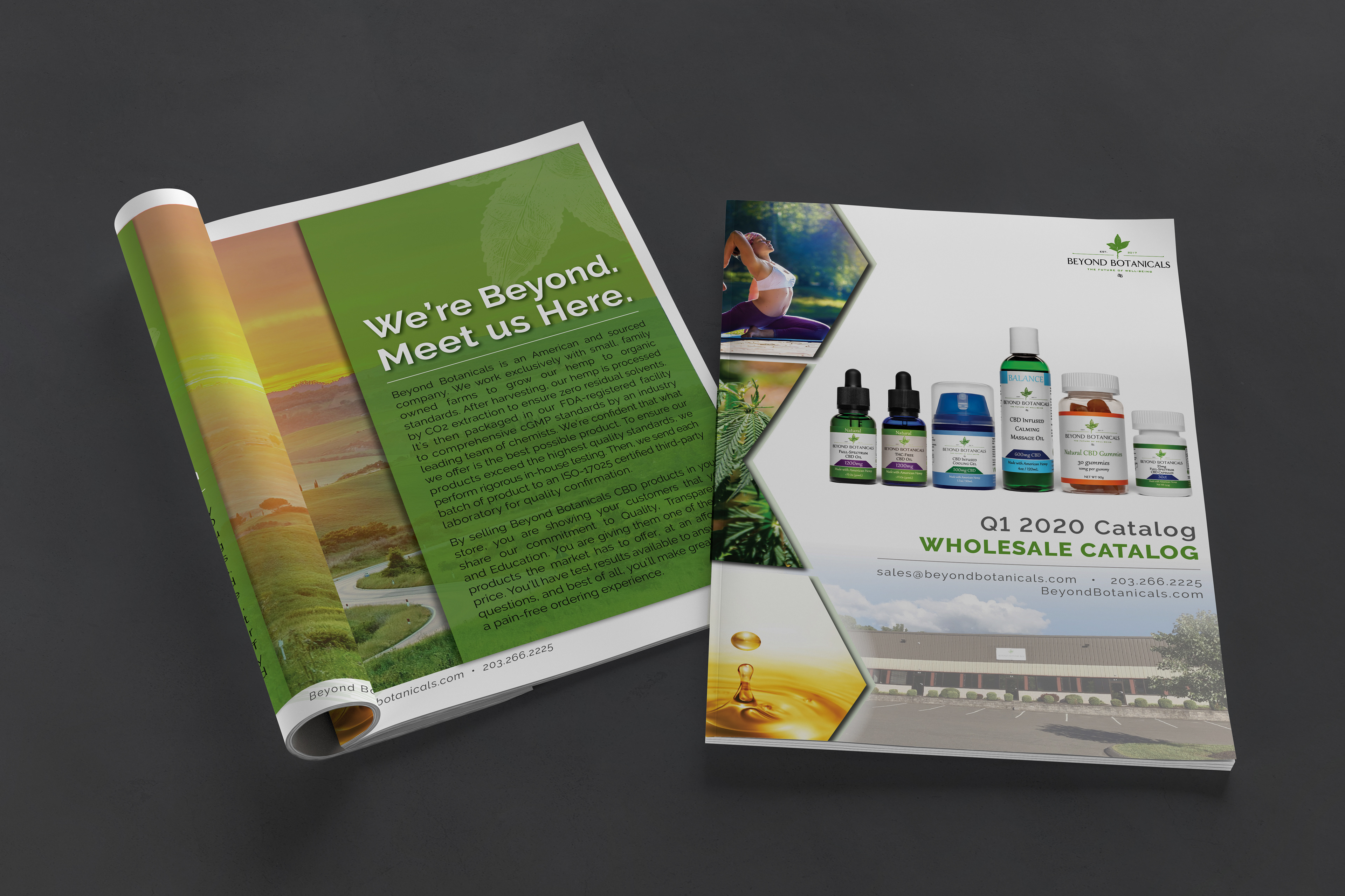 Quarter 1 wholesale catalog for Beyond Botanicals, a CBD company located in Oxford CT. Beyond Botanicals strives to be a hemp industry leader using their three core values: quality, transparency, and education. We created a beautiful catalog for them that showcases their products, while showcasing their values. For more information on their company, click on the photo below to head to their website.